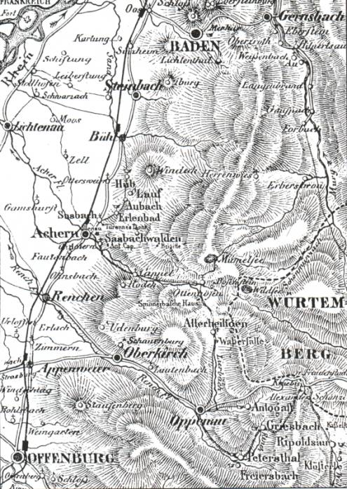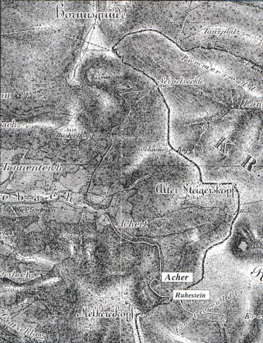 Abb. 2: Ausschnitt aus dem ersten topographischen Atlas des Großherzogtums Baden (Maßstab 1:50.000) von 1843 mit der ersten (irrtümlichen) Benennung des bisher namenlosen Quellbaches aus dem Ruhesteinloch als „Acher“ (Reprint: W. Beck 1997).