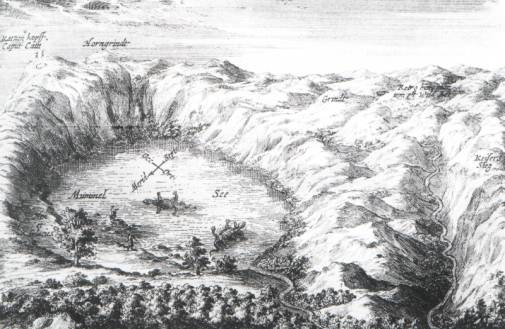 Abb. 3: Älteste Darstellung des Mummelsees (Athanasius Kircher 1678, II. Bd., S. 112) mit dem Acherabfluss („Seebächle“, nach unten) mit (heute noch vorkommenden) Bergmolchen sowie dem Panoramablick über den „Katzenkopff“/“Horngrindt“ (links oben), den Wildsee rechts von der „Grindt“ (= Altsteigerskopf, rechts oben) und das Ruhesteinbachtal von oben nach unten (=„Achert“, ganz rechts) mit Keiser´s Steg (=„Alter Weg/Alte Strasse“).