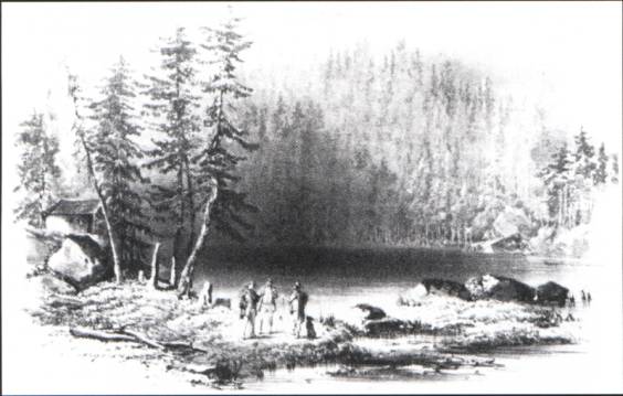 Abb. 4: Mummelsee zu Beginn des 19. Jahrhunderts: Blick auf die Endmoräne des Mummelsee-Kares mit fünf aufliegenden Buntsandsteinblöcken (= Kar-Endmoräne), dem Abfluss der Acher (= “Seebächle“, rechts unten), einer Unterstandshütte (links) und dem großen Hirtenstein an der Basis der Karwand des Mummelsees (rechts hinten; Litho aus A. Hirth 1980, S. 155).