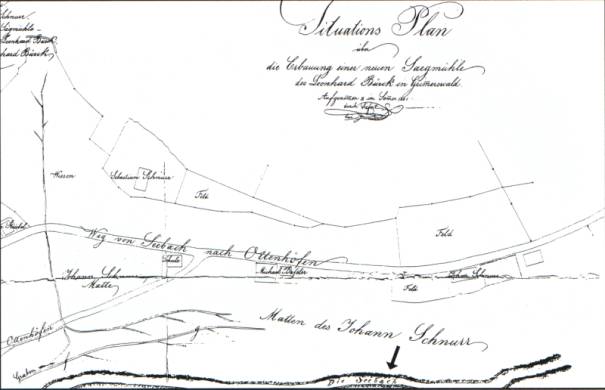 Abb. 5: Situationsplan zur Errichtung der Sägemühle Bürck (Seebach-Grimmerswald) mit die Seebach (Pfeil) als Oberlauf der Acher (Gemeinde Seebach/Staatsarchiv Freiburg/Brsg.).