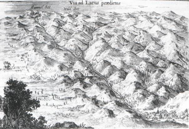 Abb. 7: Älteste Darstellung (Athanasius Kircher 1678, II. Bd., S. 112) des oberen Achertales zwischen Kappelrodeck (rechts unten) und dem Mummelsee (links oben) sowie das Unterwassertal bei Ottenhöfen (mittig) zum Kloster Allerheiligen (nicht dargestellt).
