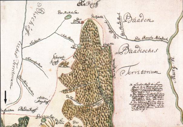 Abb. 10: Erste forstliche Karte (um 1750) im Gebiet zwischen Hornisgrinde („Dee Kopff“)/Mummel-See (mit Seebachabfluss), Baadenkopf (= Seekopf) und Ruhestein mit noch namenlosem Quellbach aus dem Ruhesteinloch (Pfeil); erste kartographische Benennung des „Ruhesteins“ als natürliches Objekt (Naturschutz-Zentrum Ruhestein).