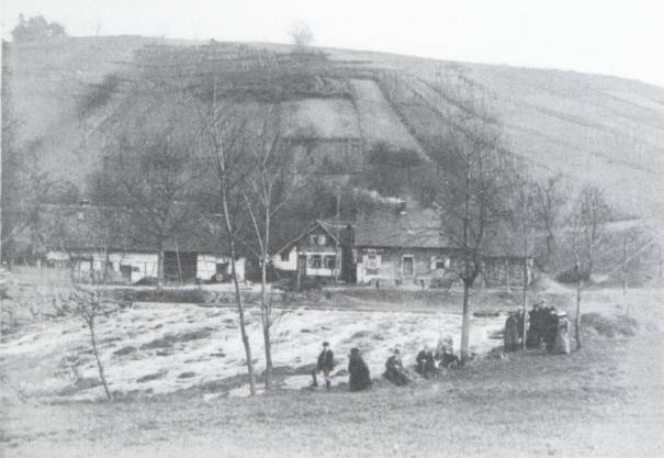 Abb.13: Blick auf das Acher-Wehr in Oberachern, Gewann „Steinbuckel“, mit der Mühlbachabzweigung und dem Bienenbuckel. Altes Foto (um 1916) aus dem Besitz von Prof. Dr. Ortlam.