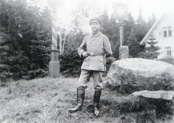 Abb. 14a: Der eistransportierte, kantengerundete Ruhestein (Sandsteinblock des höheren Bausandsteins smV, siehe Abb. 6) mit einem Soldaten des Ersten Weltkrieges im Jahre 1915 an der (ehemaligen) baden-württembergischen Landesgrenze im Ruhestein-Pass mit drei verschiedenen Grenzpfählen im Hintergrund (Leg: A. Gnjezda, Seebach).