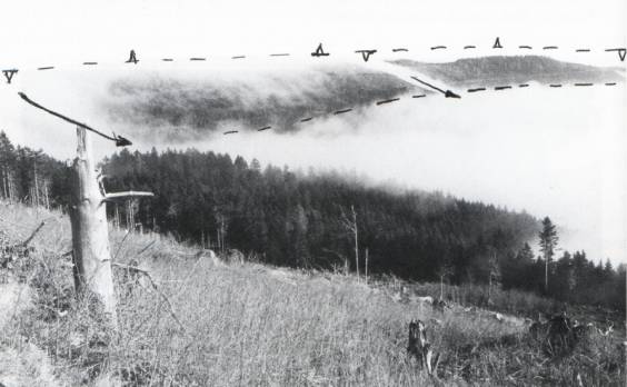 Abb. 15: Blick vom Mummelsee-Parkplatz (1.030 m NN) auf das Wolkenmeer des oberen Seebachtales mit einer Wolkenobergrenze bei 1000 m NN (badische Seite) und der bei 1.100 m NN gelegenen Wolkenobergrenze (württembergische Seite) jenseits von Schwarzenkopf-Altsteigerskopf-Seekopf und Ruhestein-Pass (von links nach rechts) mit sehr seltenen Wolkenwasserfällen (= Pfeile) am Seibelseckle (links), oberhalb Dürrbaden (mittig) und am Ruhestein-Pass (rechts). Diese zufällig Anfang Dezember 2003 vorhandene Wolkensituation (= Temperatur-Inversionslage) ergibt nun ein ähnliches Bild wie bei einer mindestens 1000 m mächtigen Inlandeisbedeckung im (badischen) Oberrheingraben und im Nordschwarzwald (Foto: Prof. Dr. Ortlam).