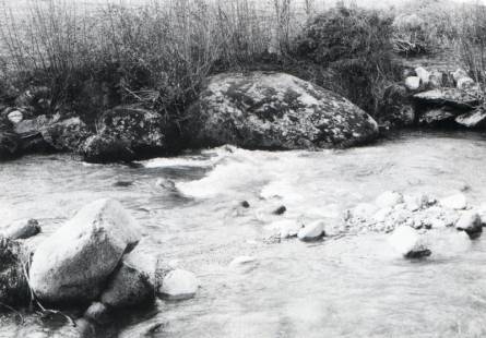 Abb. 16: Hirtenstein (links hinter dem Baum) und Acherquelle (x = Hirtensteinquelle, 1.035 m NN) in der Karwandbasis des Mummelsees; Trockenwetterschüttung Ende November 2003 mit 10 l/sec (Foto: Prof. Dr. Ortlam).